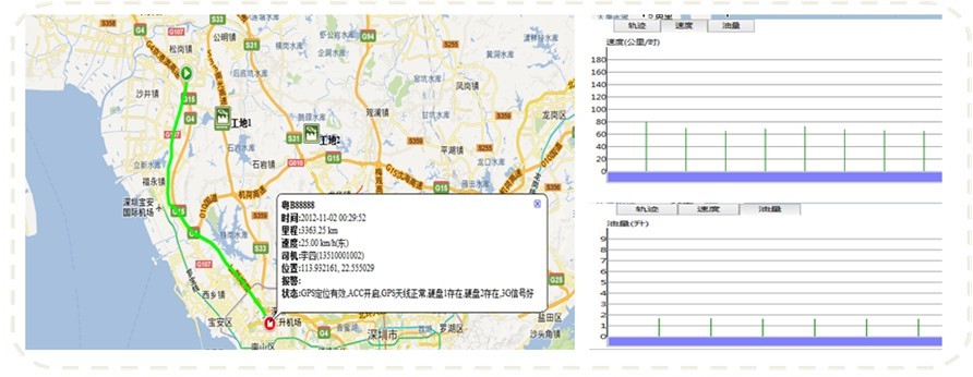 可任意查询车辆在任何时段的行车情况,在地图上动态显示车辆行车轨迹,并结合速度和油量报表,方便管理人员进行科学分析。